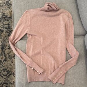 This sweater had me at pearls—the elegant sleeve details make it feel instantly special, while the soft light pink and cozy turtleneck keep it warm and wearable. It’s that perfect mix of polished and comfy.