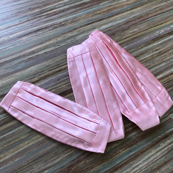 Light pink satin cummerbund has white elastic back waist with hook & loop closure. Front (satin part) of cummerbund is approx. 3 1/2" tall.