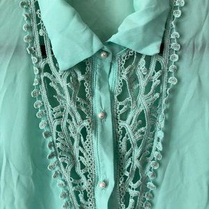 Light Teal No Sleeves Blouse with a little bit of lace and pearl buttons. See-through fabric, perfect to wear a bralette of your choice beneath it. Can be worn with black formal shorts or jean shorts for a more casual look.