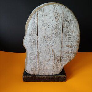 This skull tabletop decoration is made out of plastic to look like wood, stands just over 11 inches, the base is 6 inches wide.