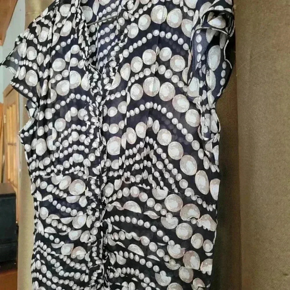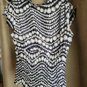 This top has several interesting design features with v neck & ruffles down front then horizontal pleats from waist down. cap sleeves