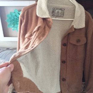 Super comfy light brown with white fluffy interior element jacket. Fits more like a medium although it says large