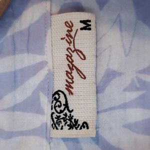 Very light, gauzy, cotton, button up blouse. Size medium, has a roomy fit. Light material, great for layering, using as a beach top, or tying/rolling up into more of a casual tee shirt.