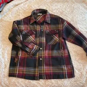 100% polyester light jacket , very cute has a warm silky softness to it. The colours are very vibrant pulls lots on the pinkish couldn’t seem to get it on picture much. Worn once has side pockets a plus. It says medium but fits like a large if need be.