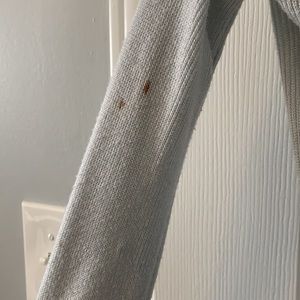 Small stain on the arm as seen in photos. I’ve tried everything to get it out and not sure what it was. Barely noticeable when wearing.
