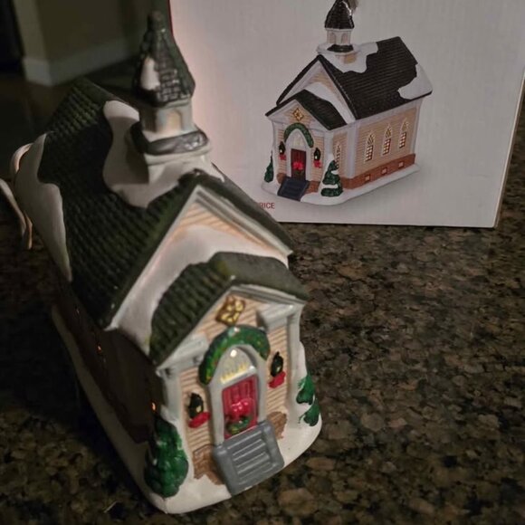Lighted Porcelain Christmas House – Chapel Design with Wreaths & Trees