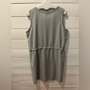 Ultra-light sleeveless dress in soft grey by Joe Fresh+. Features a relaxed fit with round neckline and adjustable drawstring waist for a flattering silhouette. Perfect for hot days, travel or layering. Size 1X.