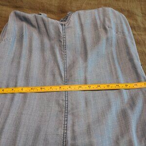 This denim dress has an A-line/ trapeze shape with a high-low hemline. It is a full maxi length on me, but I'm only 5'2" so it's likely a midi on someone taller. It has a low v-neckline and a very interesting cross back detail. It also has pockets! The label says New York and Company, and it's 100% Lyocell. It's in good condition, lightweight, and super comfortable for really hot summer days, though could be layered later in the season. It also washes really well. I quite like this dress, I just found that the color washes me out too much, so I want to pass it on to a better home!
