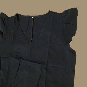 Lightweight V-Neck Ruffle-Cap Sleeve Frilly Sundress (Dark Blue)