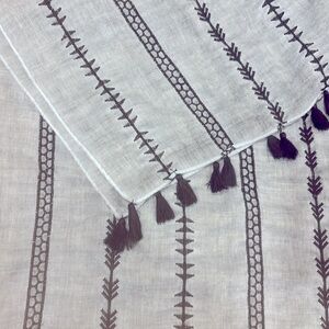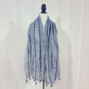 Lightweight long rectangular summer scarf in a beautiful blueish-grey hue. It has elegant tassels on both ends and intricate black embroideries.