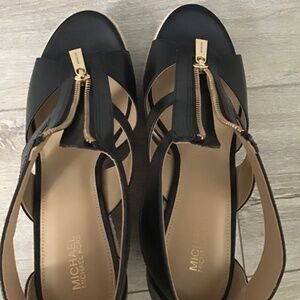 Like New Black leather Michael Kors Damita raffia wedges size 8.5