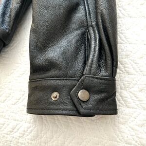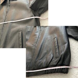Classic Black Leather Bomber Jacket with quilted lining from Croft and Barrow. Front Zip, Classic Collar, Slash Pockets. Two inside pockets. Snap wrist cuff. Size Medium with Approx. Flat Measurements of Chest 23”, Bomber Hip 19.5”, Shoulders 19.5” Sleeve 26”, Length 25”. No wear on this jacket, like new. One tiny flaw is a pin dot size hole just above the hem on the front left side. It is so minuscule it hardly shows up but I included a close up photo to disclose. Original price US$325.