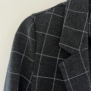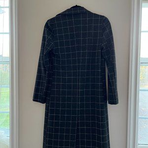This is a light weight coat in a charcoal colour with check pattern. Duster style coat, for reference I am 5 foot 3 inches and the coat falls to mid calf. No closure on the coat, it is meant to be worn open. This is a size XS. Only worn a few times, excellent condition.