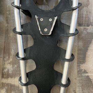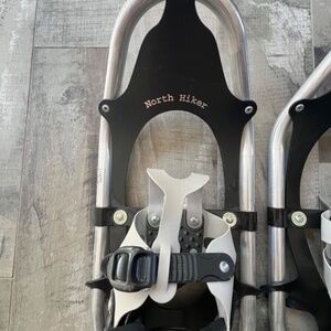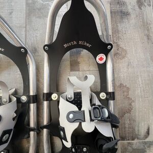 In excellent condition - used twice. For the beginner or causal hiker, this robust, aluminum snowshoe is light and easy to use. It is designed to be used on packed snow and has many many advantages such as lightness, maneuverability and snow on the deck is easily shaken off. See last pic for measurements.