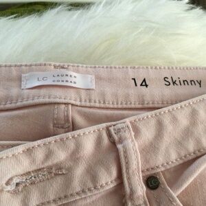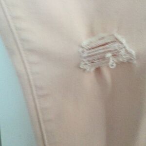 Like new condition, very comfortable due to the fabric and fit. Fabric is 65% cotton, poly and spandex. Strategic placement of shredding on legs of pants for an edgy look, as styled, it’s not a flaw, but the design of the pants. Ankle length with frayed hem look again styling of the pant. I loved them, but didn’t fit me. Size 14 Skinny, an a lovely pale pink denim style.
