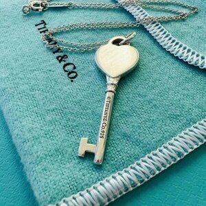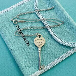 This is a sterling silver Return to Tiffany heart key necklace. The key measures 1.5 inches and the chain is 16 inches.