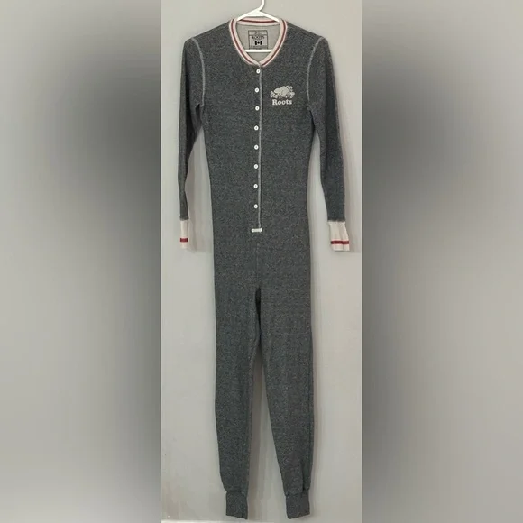 đLike Newđ Roots: One Piece Pajamas- Size Small. Classic one piece pajama with the Roots logo & colours. Features an open back area to remove bottom part without taking the top off entirely, button closure, elastic hems on wrist & ankles for an easy fit. Perfect for the cold winter nights or as an extra layer underneath. These are previously owned - the extra button is still attached to the material tag indicating that these may not have been worn very much (if at all) There appears to be little to no visible wear, washing wear or fading throughout (Made of polyester & cotton.