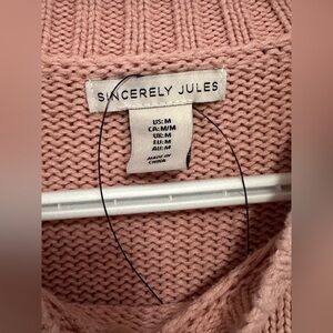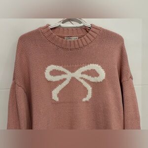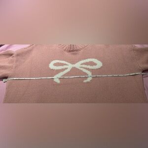 Chic pink sweater with a bow accent in like new, excellent condition with little to no visible wear (This sweater could be NWOT although I am not able to confirm) Beautiful design, warm & cozy- can easily match with a variety of bottoms. Please view last two photos for laying flat size visual (pit to pit & top to bottom are both approx 24 inches. Made of cotton & acrylic.