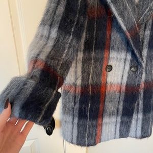 Like new stunning Smythe Mohair, Alpaca and Wool double breasted coat. Features back vent and lined interior. Made in Canada and beautiful quality. Has a thick weight to it and plaid print. Size XS but fits up to small very comfortably.