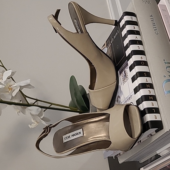 Steve Madden Size 8, but fits 8 or 8.5 taupe/greige/nude/tan peep toe heels. Patent finish on man made leather.