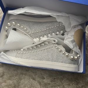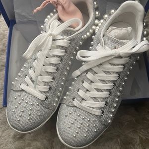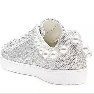 One of Stuart Weitzman’s top fashion sneakers, the GOLDIE SNEAKER in sparkly silver platino features a playful combination of oversized and mini pearls for a cool new take on their signature pearl embellishments. Note the pearl accents arranged to create a gradient effect on the back counter — this detail-oriented lace-up embodies effortless glamour and modern femininity all at once in one statement-making sneaker. This look is part of the SW Sneaker Edit, a range of silhouettes designed for easy versatility and polish.