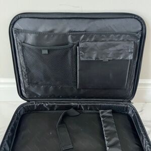 Great bag with padded handle and removable shoulder strap. One zippered section has a divider to keep paperwork organized. Second zippered section included padded strap and a velcro strap to secure laptop safely; both interior and exterior zippered sections have a covered flap pouch; net pouch and larger velcro pouch. Exterior zippered section All zippers/closures working well. From a smoke free home.