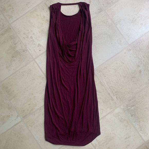 This gorgeous number is a beautiful purple merlot colour, with an open back cowl neckline, sleeveless tank with little pleated detail on shoulders, and slight high-low hem.