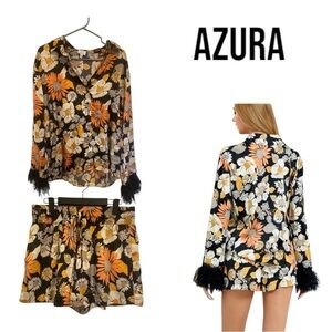 These PJ’s scream pajama party/ bachelorette ❤️❤️The delicate feather details add a touch of glamour, making it perfect for lounging at home or for a stylish sleepwear look. Whether you’re treating yourself or gifting someone special, this set offers the perfect mix of comfort and sophistication.