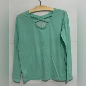 This girls XXL top was washed & never worn. Beautiful colour & sparkle design. Excellent pre-owned, like new condition. Unique design on the back as well. Made of cotton & polyester.