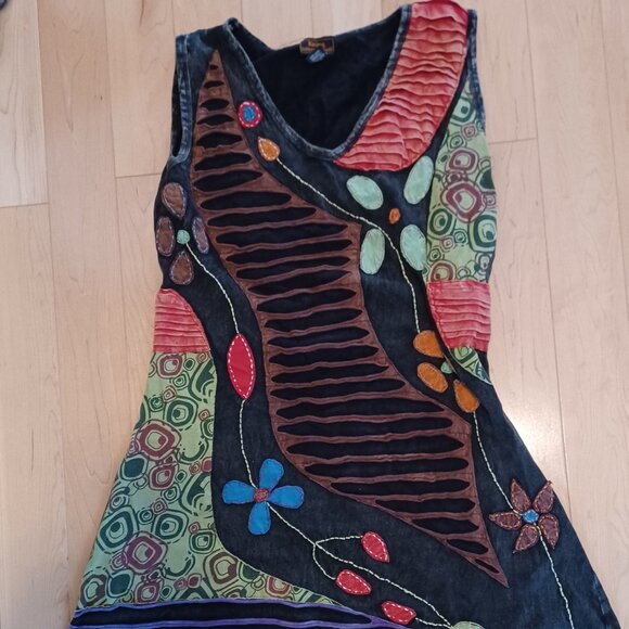 This unique women's tunic top is very colourful and happy. Can be worn by itself, or with a long-sleeved shirt underneath. Made in Nepal and made from 100% cotton, this piece is very light, and in excellent condition. Size small.