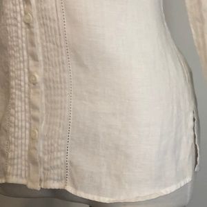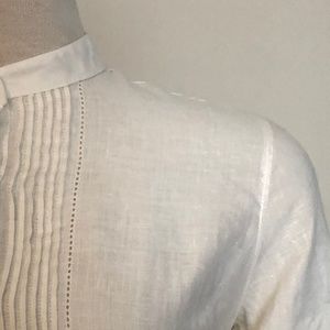 Description: White linen button-down with tuxedo-pleats, mandarin collar and decorative stitch-detail. Shirt is in like-new condition with no signs of use or wear and will arrive clean and ready-to-wear from a pet and smoke-free home.