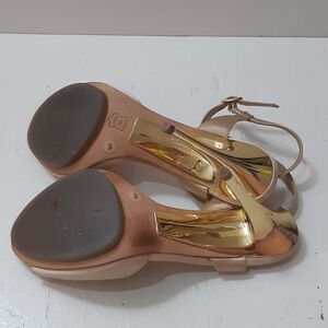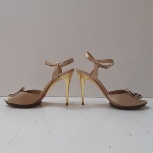 Beautiful metallic gold stiletto heel on a coffee cream satin strappy peep toe shoe with a crystal embellished concave metal disc detail at toe. Adjustable ankle straps with some discreet elastic for flexible movement. Nude leather footbed sole with some padding. Leather outsole also, with a polyeurethane toe platform which helps greatly in their comfort. Dancing shoes! Size US 7B or 37. Worn once.
