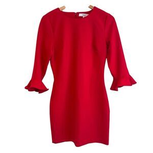 In excellent condition. Likely Bedford mini dress in a stunning scarlet red. Likely's coveted fabric- Favorite Stretch fits to perfection everytime always slimming and hugging your body in all the right places. With its three-quarter length sleeves embellished with peplum hems, this fitted mini dress is perfect for any occasion. The long sleeve with ruffle details makes this fitted mini a stand out!