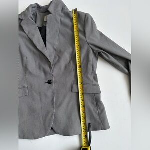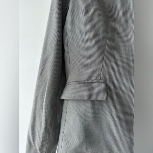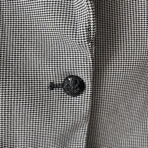 A Classic blazer, a fine houndstooth pattern with black detailed buttons on front and cuffs. This blazer has shoulder pads for structure.