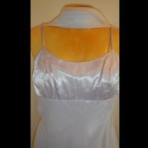 Spaghetti straps, lilac gown with empire waist. Embroidery on the bodice. Chiffon bottom. Matching scarf included.