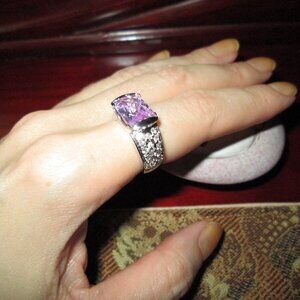 Lilac Ice Cubic Zirconia Fashion Ring flanked with pavé cz stones. Silver plated metal alloy. Simulates Amethyst and Diamonds. Purchased 2008 and unworn.