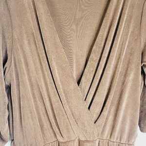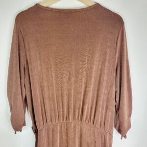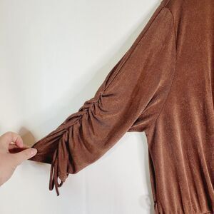 Stylish cocoa brown V-neck dress with ruched 3 quarter length sleeves which can be adjusted via drawstrings. Perfect for many occasions. Lovely slinky weight fabric. Faux wrap front surplus V bust. Elastic waist. Lots of stretch in general. EUC