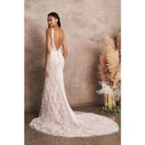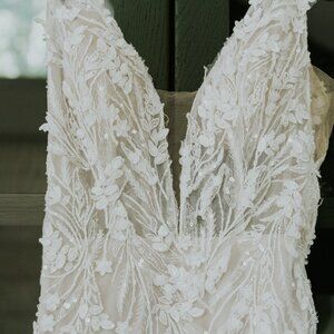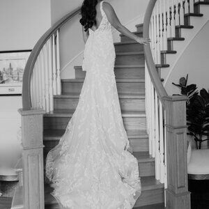 Condition: This dress was worn for a September 2023 wedding. It has been professionally dry cleaned. A seamstress has put in a bustle. It has been altered in the straps and waist but could be taken back out. It was hemmed as well. I am 5'4" and wore 3" heels with it. There are a few beads missing off it, but it is in very good condition.