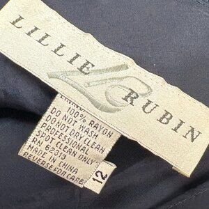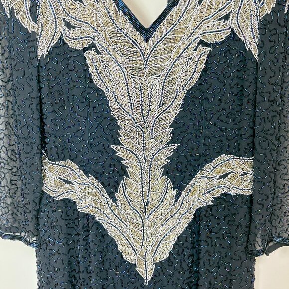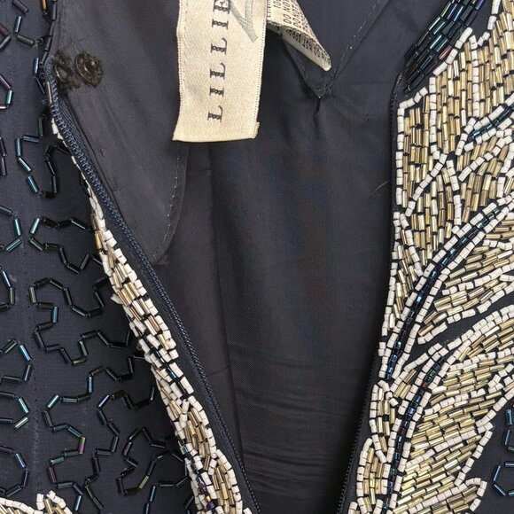 This exquisite full-length gown by Lillie Rubin features sheer midnight blue sleeves, and intricate navy/white/iridescent beading and embellishments that are in a beautiful swirling pattern. This dress has shoulder pads, a V-neck and a slit at the front, and a keyhole back opening, zipper, and a hook and eye closure on the back. This gown is ideal for collectors, galas, or elegant evening affairs – Made in China