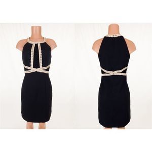 Elegant black mini dress with white lace trim. Sleeveless design. Perfect for any occasion.