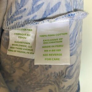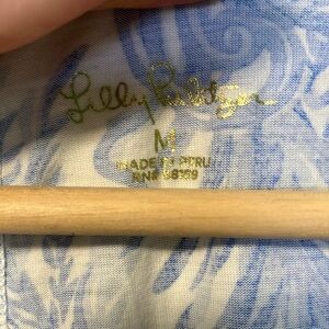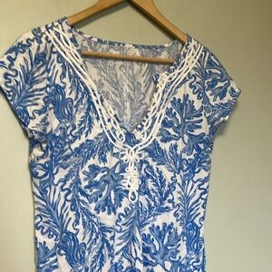 Stylish dress with a blue and white pattern. Features a V-neck design.