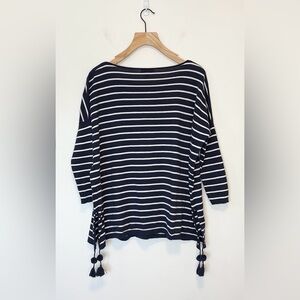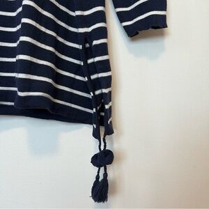 Easy Fit 3/4 Sleeve, Boat Neck Pullover With navy white Stripe, Pockets, And Tassels. Body: Coolmax (65% Cotton, 35% Polyester). Sleeve And Pocket: 53% Cotton, 27% Polyester, 17% Nylon, 3% Spandex. Coolmax : Breathable Knit With Coolmax ® Helps You Stay Cool, Even In Hot Weather. Coolmax ® Yarns Wick Moisture And Dry Quickly