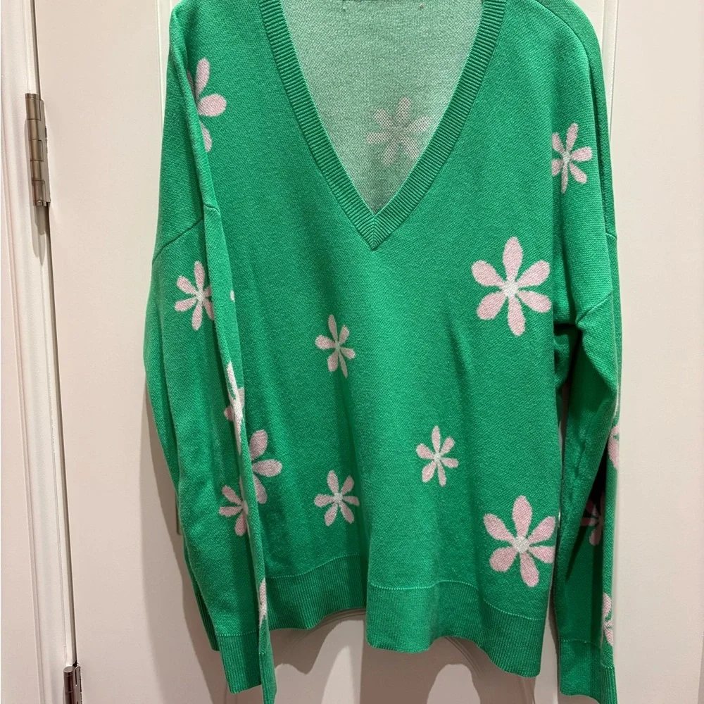 Chic green V-neck sweater with pink floral accents. Ideal for a stylish look. Size tag has been removed.