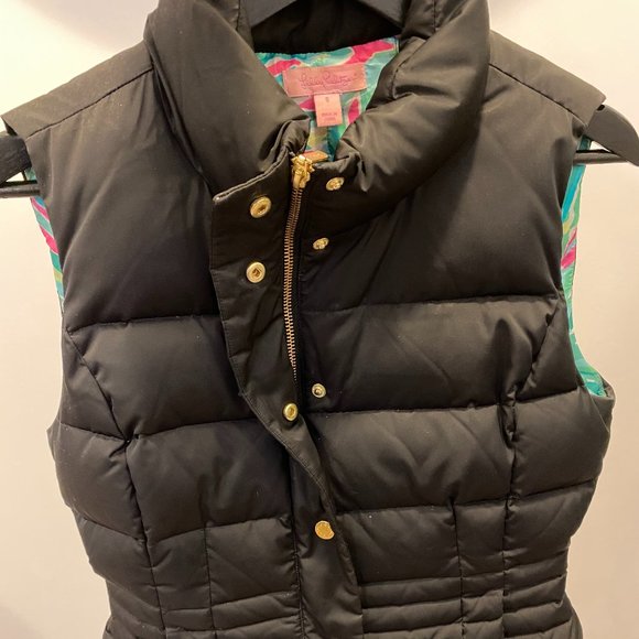 Black Lilly Pulitzer Kate Puffer Vest with gold zipper & buttons! Adjustable strap on the back, excellent condition! Classic Lilly Pulitzer print on the inside!
