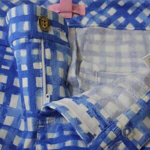 Features: cotton / elastane blend, low rise, button closure, zip fly, blue and white gingham print with LILLY hidden in the print