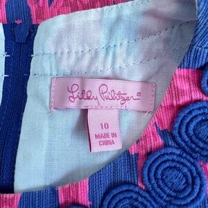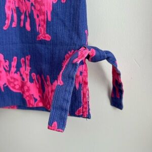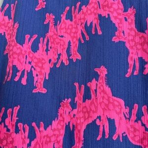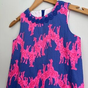 Lilly Pulitzer shift dress. Windsor Giraffe Print. Beautiful blue and hot pink. Adorable lacy Lilly lining along the inside. Lined. Zipper. Detailing around the neckline, cute accent ties at the bottom.