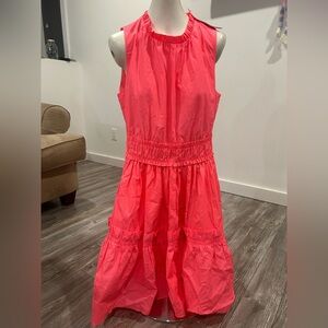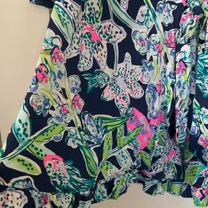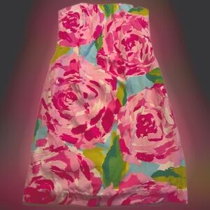 Chic romper with pink, white and green accents. Elegant and vibrant design.beautiful ruffled edging. In very good condition, no navy fading.