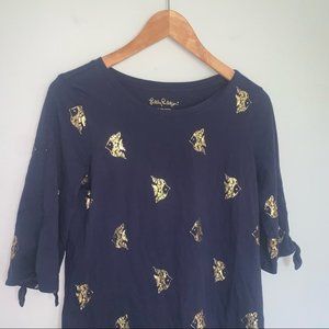 Lilly Pulitzer Shirt Size Small Navy Gold “Reel It In All Over” 3/4 Sleeve Flowy