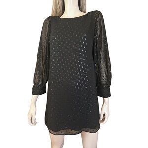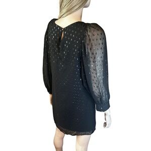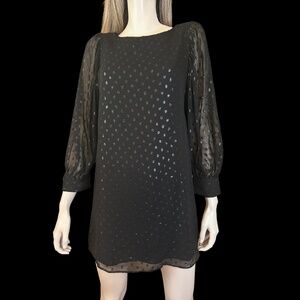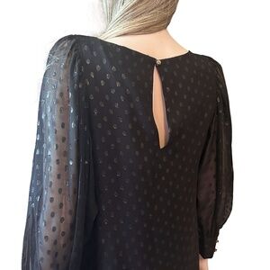 Features: All over silver spotted sparkle, long sheer bracelet length blouson sleeves with gold button at cuff, mini length, classic shift silhouette, keyhole at back with gold button closure, rounded neckline, non stretch