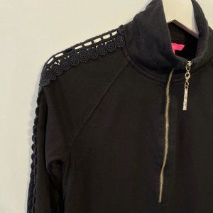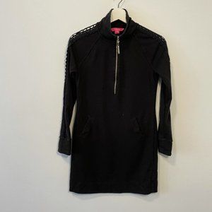 -Solid Straight Skipper Pullover Dress With Half Zip Neck,Novelty Zipper Pull, Functional Pockets, And Lace Trim At Sleeves.